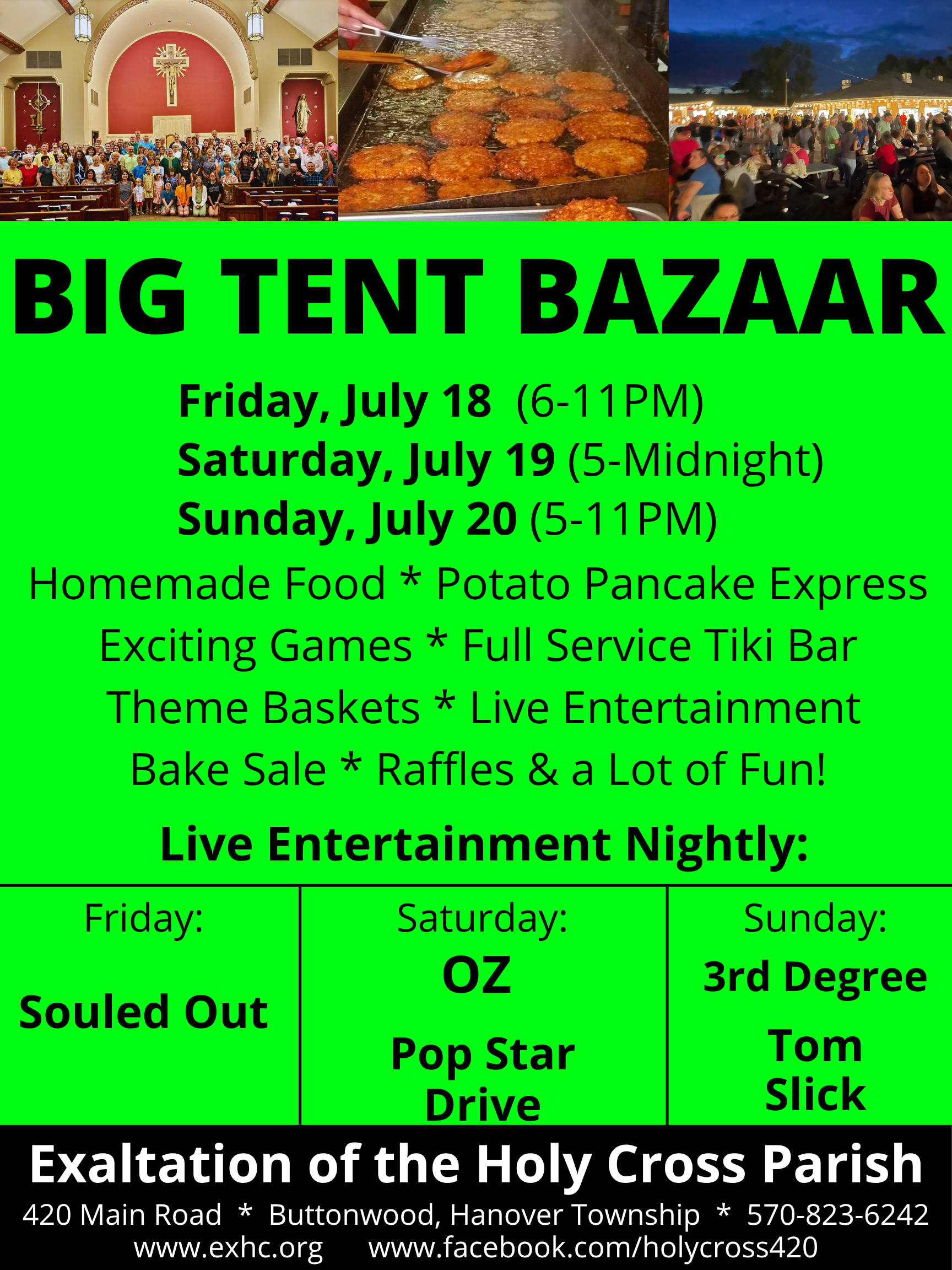 Social on church grounds (Catered meal, beer/soda/water, dessert, ice cream truck, DJ, yard games, raffle drawings, games for children, time spent with fellow parishioners & more!)